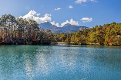 五色沼や曽原湖など300を超える湖沼群との紅葉のコントラストが美しい
