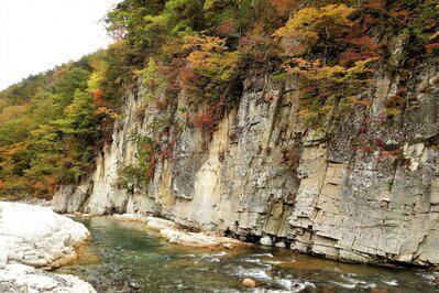 切り立った白い崖の岩肌にモミジが映える。前沢曲屋集落・温泉とセットで♪