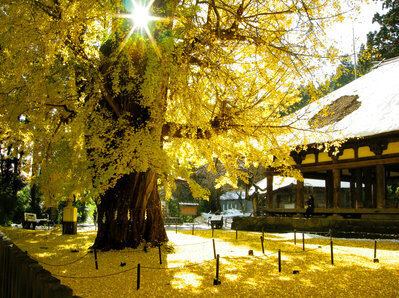 樹齢八百年の「長床」大イチョウの絨毯と拝殿