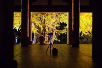 新宮熊野神社の「長床」では、大イチョウが黄金の光を放ちます。